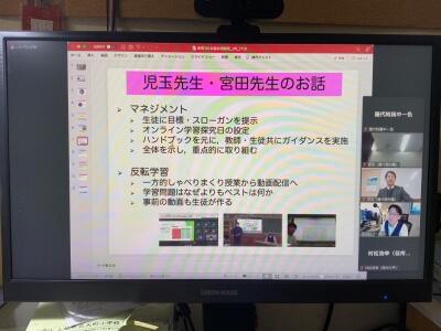 〇2月15日(火) 「教育DXお悩み相談室」という、信大と県教委が開催している企画にK先生とM先生がゲスト出演しました。30分という短い時間でしたが、本校の取組(マネジメント)と授業実践(反転学習)をお二人の先生に紹介していただきました。オンラインでの授業でも、平常時での授業でも、端末を活用することによるメリットがないと「文房具」にはなれないし、先生方も端末を活用しようとは思わないんだろうなと感じました。その意味でもお二人の説明は、端末活用の利点と魅力を十分伝えることができました。今回はお二人に登場してもらいましたが、本校はどの先生の実践も十分事例となるものです。現在のコロナの様子だと、オンライン授業のやり方を中心に、まだまだニーズがありそう・・・。さらなる進化へ。すべては子供たちのために。