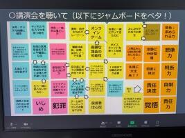 〇2月21日(月) 情報モラル研修会では、戸倉小の宮原先生からお話をお聞きしました。ネット依存症にならないようにするには、熱中→惰性→依存の、惰性の段階で一時停止し、複数推測し、慎重に検討したうえで自己責任で決定することの重要性を学びました。併せて、ネット社会では、大人も子供も一市民であることなど、宮原先生の一言一言が生徒の皆さんの心に確かに届いていると思います。それは、情報発信委員会がお話を整理してくれたジャムボードをみればよく分かりますね。今から、ここから。この研修を生かして生活して全員が80の幸せを手に入れることができるようにしよう。