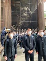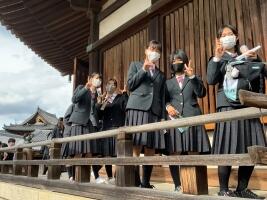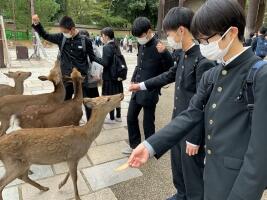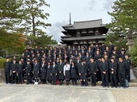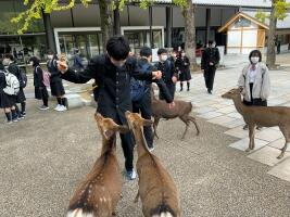 〇10月21日(木) 修学旅行3日目。最終日は、奈良に移動し興福寺、東大寺、法隆寺を見学しました。京都とはまた少し違った古都の風情を感じました。ガイドさんの説明に耳を傾けながら、その大きさ、美しさなど目に焼き付けることができました。特に、法隆寺金堂のお釈迦様のアルカイックスマイルには、「ほんとだぁ~。少しだけ微笑んでいるみたい!」と興味津々な生徒もいました。 コロナ禍につき、実施が不安視された修学旅行でしたが、80名全員参加できたこと、3日間救急箱を開かずに済んだこと、天気がとてもよく気持ちよかったこと、そして、生徒のみなさんの行いが素晴らしかったこと、とても思い出に残る素敵な修学旅行でした。あっ、ちなみに天気が良かったのは、S&Wの“担任晴れ男コンビ”によるパワー炸裂のおかげです。